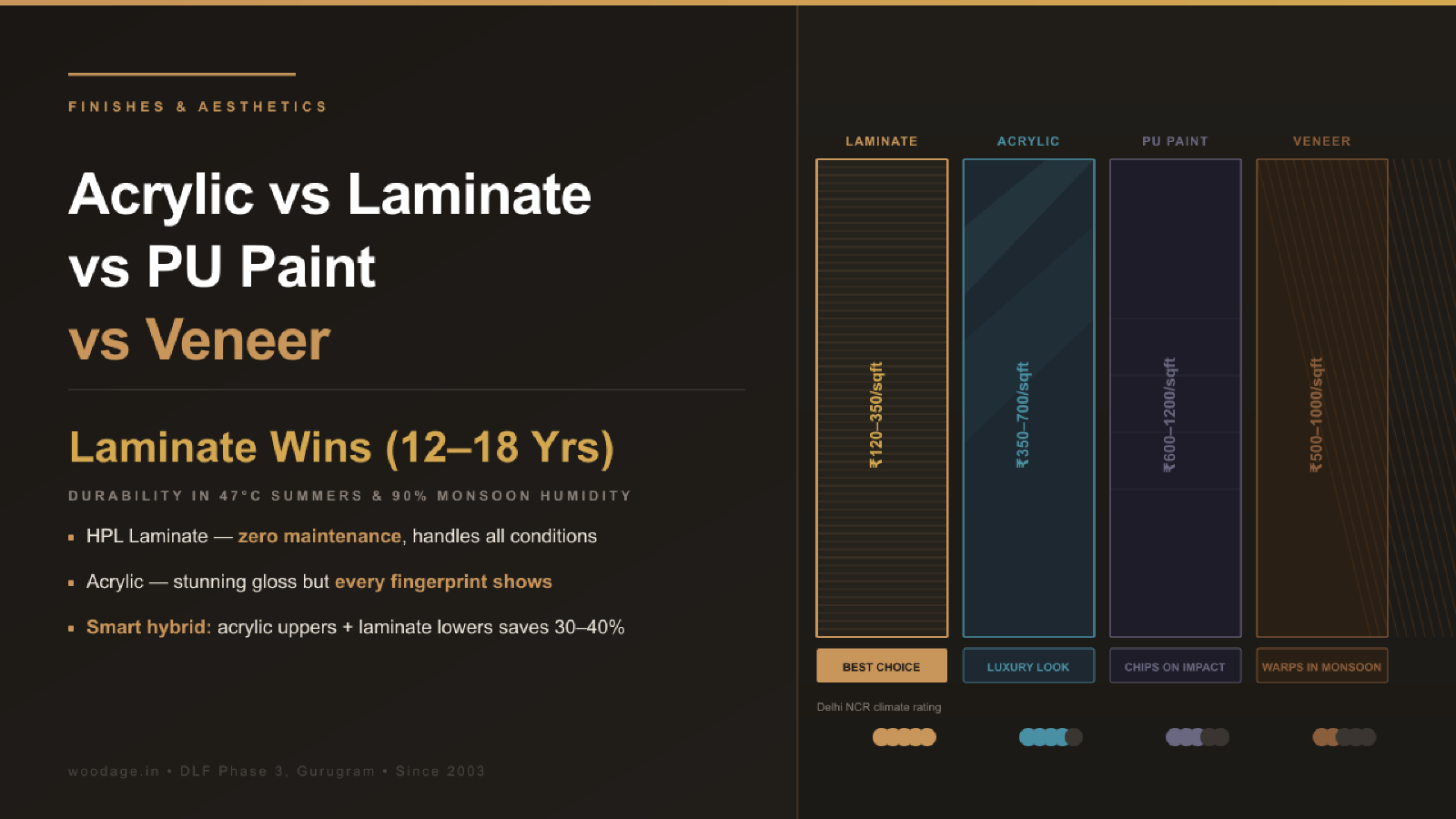 HPL laminate is the best kitchen shutter finish for Delhi NCR — handles 47°C summers, 90% monsoon humidity, and daily Indian cooking with zero maintenance at ₹120–350 per sq ft. Acrylic looks stunning but needs daily wiping. PU paint chips on impact. Natural veneer warps without air conditioning. Smart choice: acrylic uppers, laminate lowers — looks premium, cuts cost by 30–40%.
